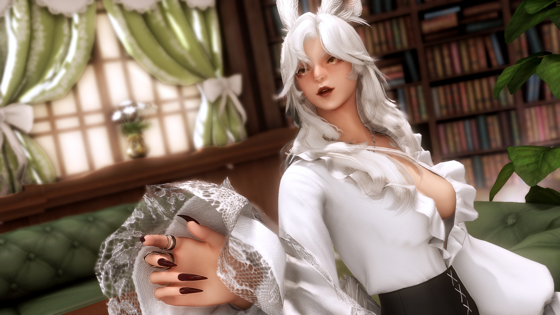 After she hunted for the day, Mordiel left her prizes in the stocking hut. That hut alone was the largest accommodation of the village, and the heart of it, making it the animated social gathering place. You could find in it a variety of comestible fauna and flora, which, like Mordiel, other girls had brought. The hut was bustling as always, maybe unusually livelier than any other time of the year. Many Vieras who returned from hunting and gathering were there as well, deposing or even bragging about their daily accomplishments. The village was inside a very large forest. The stock never ran low, and there was always enough of it. But this time, there was surprisingly double the quantity of food that was brought. This surprised Mordiel because usually they didn't overhunt or over-gather to not harm the ecosystem in which they lived.The groups of vieras were having chats about their hunting prizes, about the upcoming days, or even their future hunting. Their chit-chat didn't distract their attention from noticing Mordiel, who was grabbing fresh fruits and vegetables that could suit her dinner stew.“Excited?” One with a smirk on her face asked Mordiel.“Surely. Fully grown and so colorful, they must be a piece of heaven in the mouth,” Mordiel answered, acting cluelessly but with sultriness.The other Vieras gave each other quick looks and giggled, lightly disturbed by the way she replied. They did not continue the conversation with the passionate fruit gourmet. The women were disappointed by not catching any gossip from Mordiel, as she was known for many of her qualities; one of them was having the heartthrob of the woods desiring her. But they kept discussing as Mordiel was walking through the stock to keep gathering a few more things for her stew, they were mentioning how the males would be allowed to enter the village for some time again.Lost in her thoughts about tonight's dish, she didn’t reflect on the news. Such news, usually among Vieras, was immensely awaited since it only meant the mating season would soon begin. That sort of event happens rarely, every 2 or 3 astral cycles; the purpose of it is for them to procreate only. Typically, romantic bonds could be forged during those times; that is how Mordiel and Srebro met in prior…20 astral cycles ago. During these cycles, Vieras usually did not have much contact with their peers of the opposite gender, compared to people from outside the woods; gender was not a gist of affection. However, this did not concern Mordiel. Often during her getaways in the woods to harvest, she took the chance to find her crimson-haired swain far in the woods where trees were down and offered a verdant framed window to the sky.Mordiel headed back to her suspended tree home with what to fill her desires. Her hut was the most welcoming, as it never failed to greet people with a scent of lilies that called to be eaten as it felt sweet when inhaled, almost like a cake left next to the window to cool down after being baked. That scent was coming from perfumed oils she would blend herself, for her and anyone asking her one, and to that scent the lilies growing around her place were adding themselves. Not a single wilting lily could be spotted, not a single overwatered leaf; she cared so much for them as if they were a part of her. Petals white as her hair, the anther yellow like her eyes, the flower delicate like her skin.The woman was always content with the way her own spot welcomed her, but today her mind was taken by her bringing to start a stew perfect to forget the upcoming night breeze.But the noises coming from outside the hut were telling her that she wouldn’t be enjoying dinner in silence, nor alone. No one else walked like her; her footsteps were so recognizable that Mordiel already had her name on her lips, ready to be uttered.“Phes,” the smiling chef said as her guest crossed the doorway.“Hello, darling. It smells lovely, doesn’t it?”“You came to my home thinking it would be any different?”“Love, I meant your cuisine.”“Oh. It’s lovely, isn't it? You wouldn't mind staying to share it, Phesy?”“I was hoping to be invited,” Phes said as crossing the room to reach and lay on Mordiel’s bed.“You’re making me unsure about who’s inviting who,” the host said as she turned around to see why she heard planks cracking.“Later,” said Phes with her head deep in a pillow, to which Mordiel giggled.“Don’t mock me, darling. It’s not often I can let myself off. I was hoping you could treat me again.”“You sure picked your timing well for that, darling~, but who will you pick when they come? I heard it's soon,” Mordiel curiously asked while preparing the bowls.“If I can get her, why don’t I try my luck with him?” the bed-nesting Viera replied with a hearable smirk.“Phesy, I’m gonna poison this stew and make sure it's your last,” Mordiel said calmly.“Oh, love, you know I’m jesting! We all know he won't even put a foot on the village's dirty paths…Unfortunate, as he is quite a sight,” Phes states.“I know, right?” Mordiel smirks while putting down the bowls, the stew ready to be eaten.With their bellies full, the women lay down on the bed. They started chatting like good friends, and just when Phes started a topic about her younger brother Artyst, Mordiel fell asleep… The tiredness from the hunting and digestion had finally caught the host.“Oh- Mordiel…” Phes sighed as she stroked the cheek of the sleeping beauty.In Mordiel’s house, Phes was like at home; she even knew how many lilies there were in the hut. A detail that no one would try to attempt to know, as the idea of the number was overwhelming itself. Grateful for the meal, she took the initiative to clean the mess left on the table by herself and her host.A bowl slipped from her hands; thankfully, it was empty and didn't create more mess to clean for Phes. Unfortunately, the scene woke up Mordiel… With pity, Phes loo