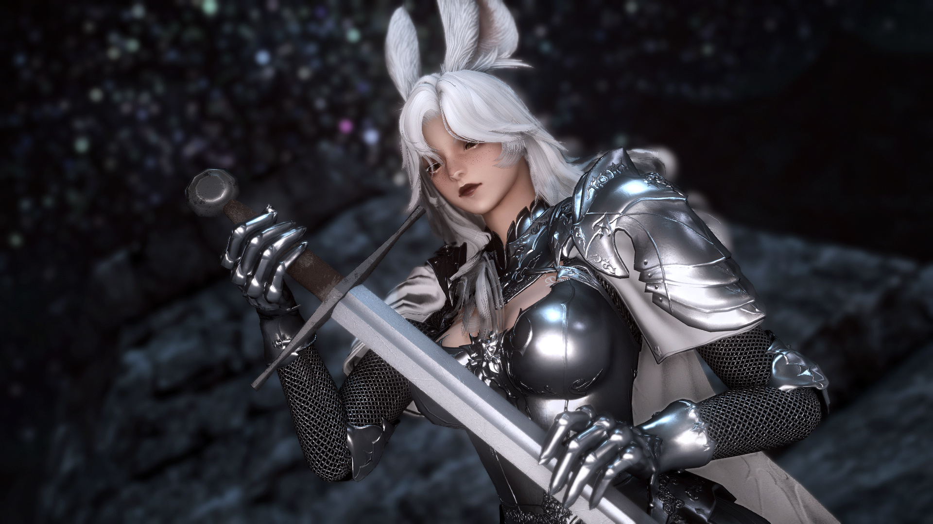 A graceful, feminine silhouette was sitting on a fallen tree trunk. The profile of a tall woman, whose body was complemented by trained outlines, was resting on a bed of soft fallen leaves. Away from what looked like a mini camp spot, with its recognizable wood fire in the middle, Mordiel was stargazing. The starry night sky, framed by the long and old trees, turned her view into a kind of remarkable painting. The cold-toned moonlight was reflecting on her purely white hair; the pureness of her hair made the reflection so distinct that it could be described that the woods had a moon of their own.Or at least that’s how Srebro was describing himself in the scene he was spectating, as he came out from the woods’ darkness with a few branches. Putting down the twigs, he approached the woman whose body was fully revealed. On this night, she was feeling breezes, the night’s dew, and safety.“My guiding moonlight,” Srebro said while stroking his beloved’s white and shining hair.His presence didn’t surprise Mordiel; her revealed naked body in his presence was proof that she felt safe and comfortable next to him. It was also another proof of the strong bond between those long-eared fellows…She didn’t wish him a welcome back, nor did she move when she felt his hand in her hair. Only her eyes moved up to look at Srebro.“You picked up some twigs, but you won’t pick me up…?” Mordiel said with her distinct, mature-sounding voice.“I wouldn't like my flower to wilt if I did,” Srebro answered with a faint smile appearing on his lips.The taller than the usual representative of his race, Viera, didn’t argue and grabbed his lady. Mordiel was on him, leg locked around his waist, arms resting on his shoulders. They both locked on each other with their eyes, but not for long. Srebro’s head was slightly above Mordiel's bosom, and her heart was calling him.Mordiel had a particularity, of which only one person was aware. The color of her usually golden eyes would turn pink when faced with very intimate emotions.[...]
