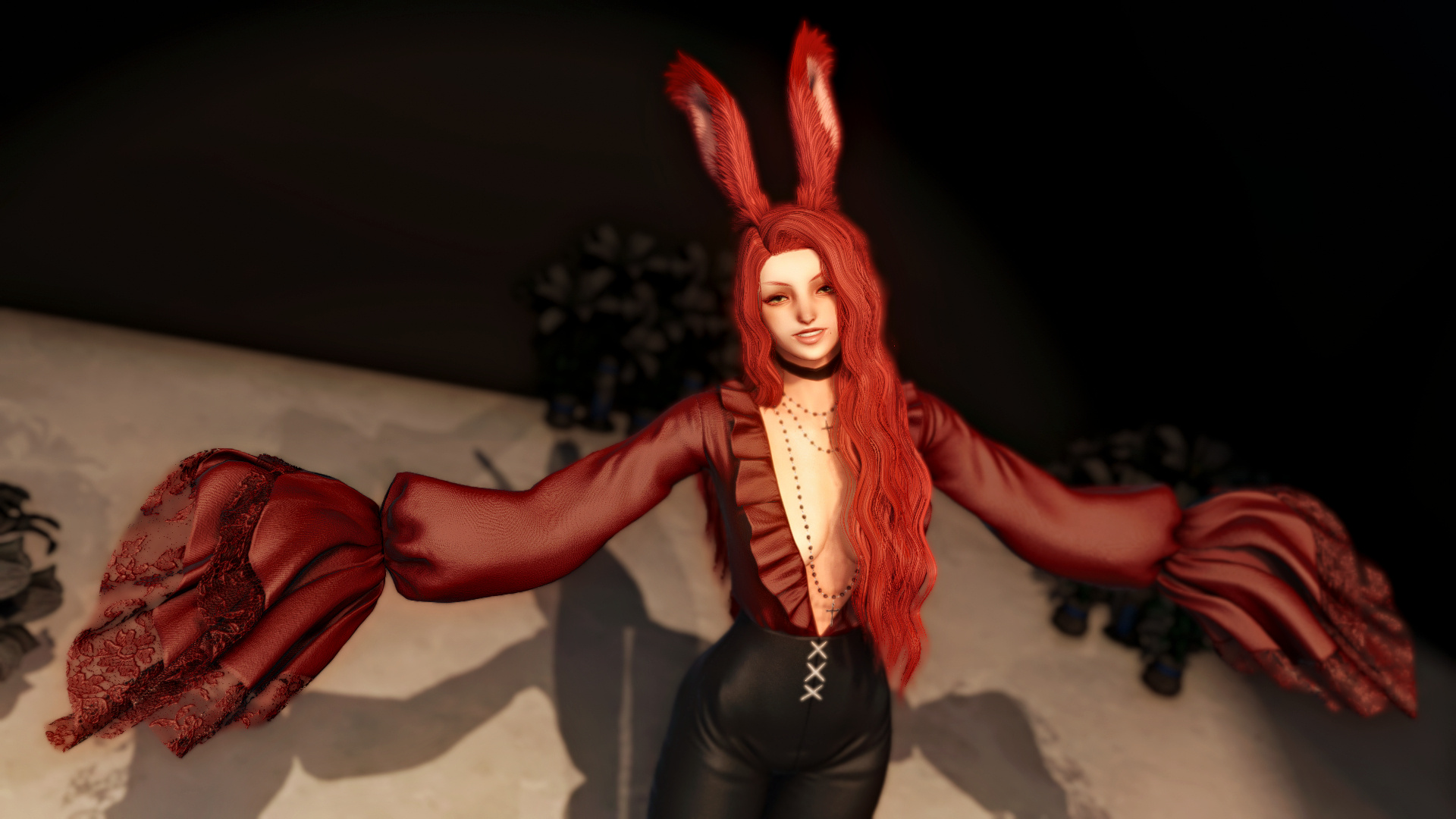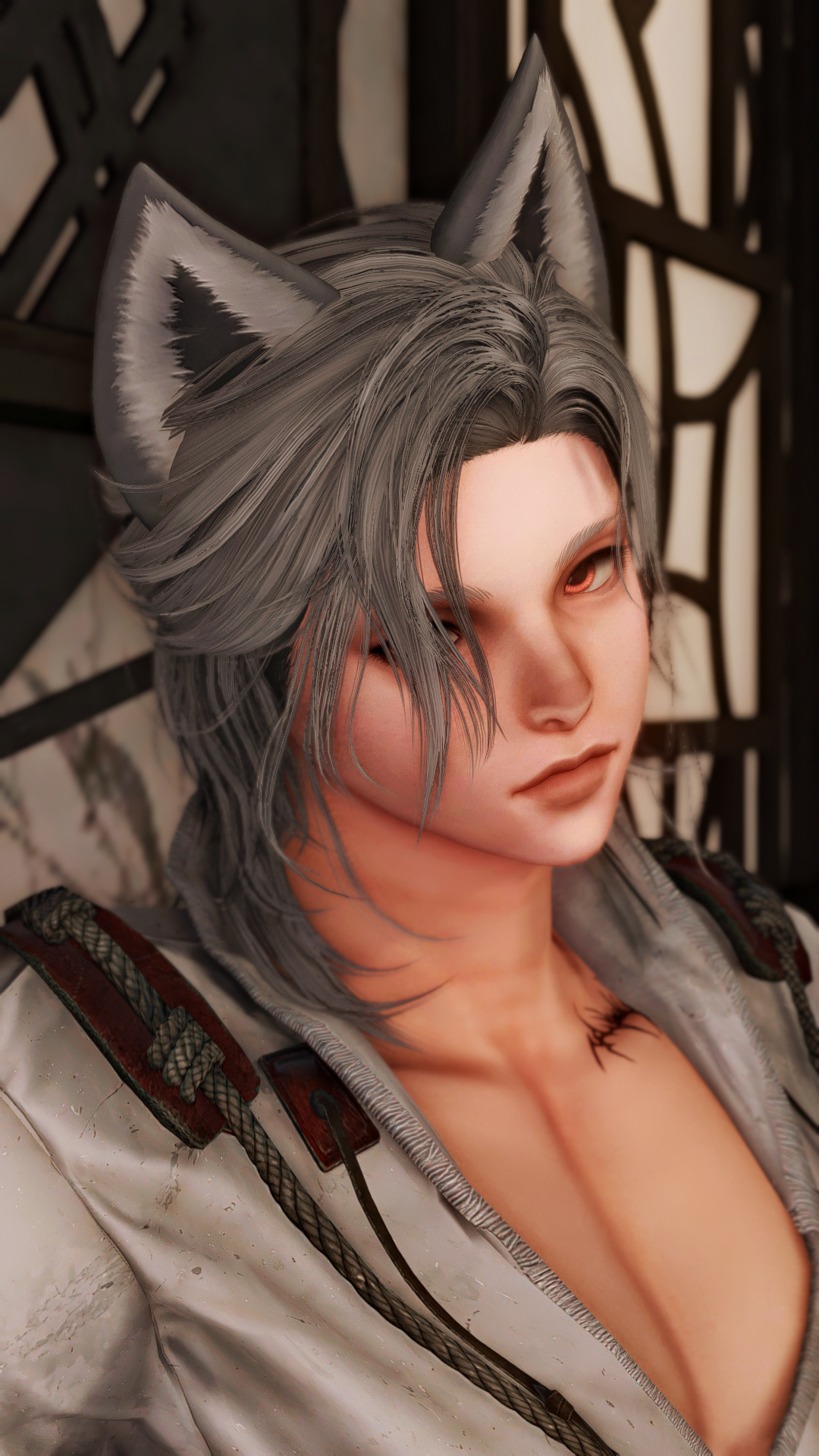 The main hall of the embassy leads to all the rooms of the building and coincidentally enough the audience room was in front of Dhel chamber as she was reaching her door, the noise of another one being opened made her turn her back to have a peek., leaving the meeting with the ambassadors was Walerina. As she crossed the door, in front of her was Dhel who out of curiosity spinned on herself, making her robe turn with her. The motion offered to Walerina a view only portrayed in Thavnairian Romance movies watchable in magitek theaters.Dhel was left breathless by the silhouette of the person across the hall. Mesmerized by the girl, the beauty, whose lipstick was matching her outfit. Her big eyes didn't move, they were focused, they were hungry, they were yearning. The glint of her lips was intoxicating Dhel’s mind. A red so distinct the last who were so shocked by it were the victims of Dalamud…Walerina was stunned, for her it was a scene, and in her eyes Dhel was like an actor living her role. It was so brief yet for her it was a movie. That moment was not a sequence but the birth of the desire to play a role in her film. The girl she was bad mouthing in her mind some moments ago now appears to be her equal?, a viera born in the far east and to add to that, a glamorous woman. The mutual attraction was lingering every second that it almost felt palpable.Walerina had to remind herself of her purpose, the meeting was done and her afternoon was about to be busy. She had to press on. With a polite smile, she bowed and headed to the main door. She could feel Dhel’s eyes, she could almost taste the longing in the air…Dhel didn’t end up going back to her room but with precipitation went to the meeting room where her parents still were. She just peeked in it and received the immediate attention of the ambassadors.